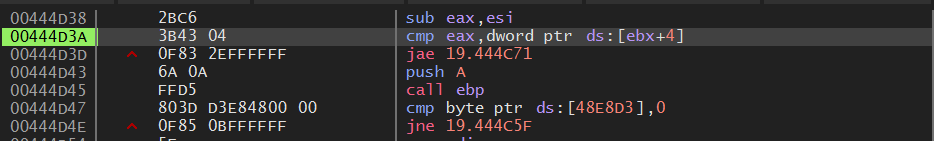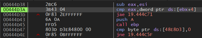 eax의 값에서 esi의 값을 뺀 후 eax의 값이 ebx+4 주소에 있는 값보다 이상이면 444C71 주소로 점프하고, 작으면 스택에 A라는 값을 넣고 ebp에 담긴 함수를 호출한 뒤 48E8D3 주소의 값과 0을 비교후 다르면 444C5F 주소로 점프한다.