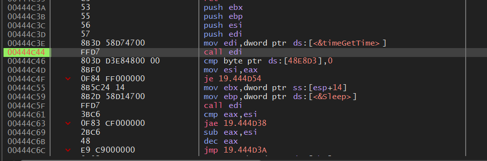 timegettime() 함수 호출 후 esi(맨 처음에 timegettime() 함수 호출 후 반환값)보다 이상이면 444D38 주소로 점프한뒤 위에서 분석한 내용을 반복한다.