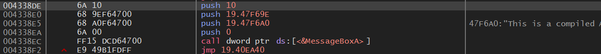 4338DE 주소는 "This is a compiled AutoIt script. AV researchers please email avsupport@autoitscript.com for support." 메시지 창을 띄우는 부분이다.