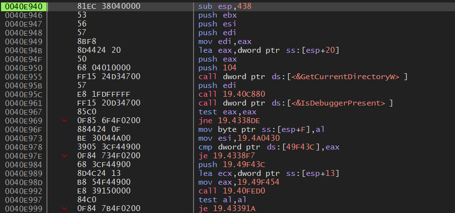 함수의 결과로 eax에 1이 담기면 현재 디버깅 중인 것으로 40E069 주소의 jne 조건 분기가 성립되어 4338DE 주소로 점프하고