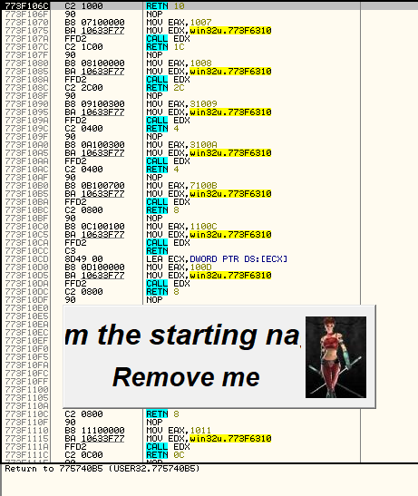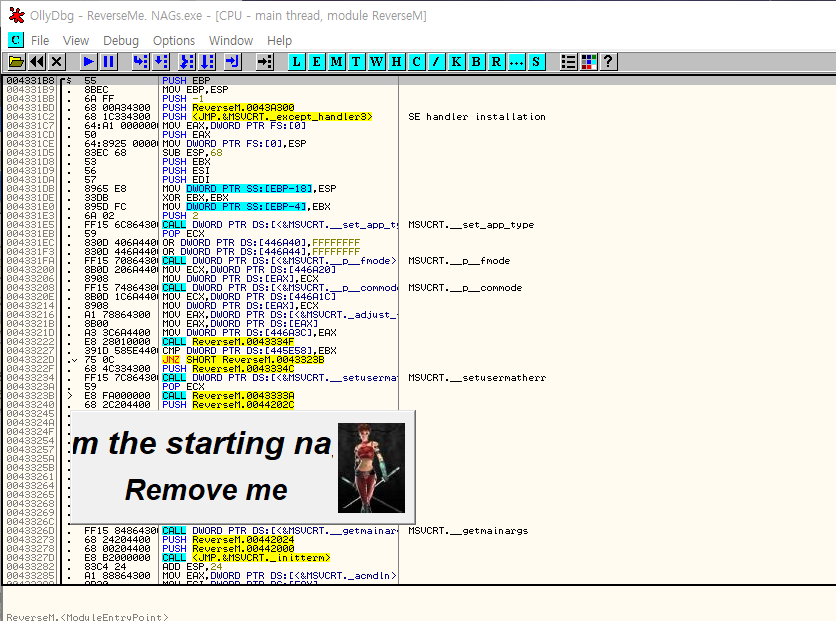 첫 번째 Nags 창이 뜬 상태에서 Ollydbg에서 F12 키를 눌러 일시정지를하면 위와 같이 멈춘다.