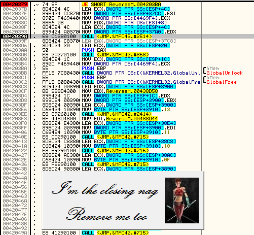 그리고 F8 키를 눌러 한 줄씩 진행하다보면 위와 같이 42039A 주소에서 호출하는 함수에 의해 2번째 Nag 창이 뜬다.