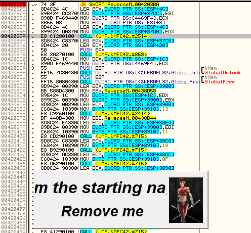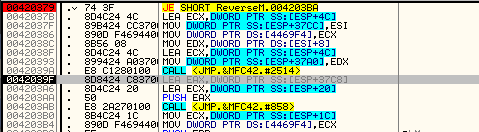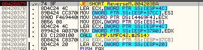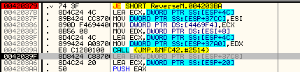 42039A 주소로 간 후 스크롤을 조금 위로 올려보면 420379 주소에 JE 명령이 있다.