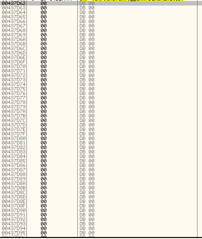 스크롤을 쭉 내리면 위와 같이 437D62 주소부터는 0으로 채워져 있다.