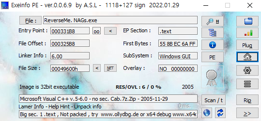 Ollydbg에 프로그램을 올린 후 F9 키를 눌러 실행하면 위와 같이 첫 번째 Nag 창이 뜬다.