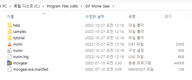 gmvgr30을 설치하면 위와 같이 C:\Program Files(x86)\GIF Movie Gear 폴더가 생긴다.