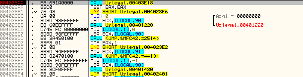 어쨌든 현재 프로그램이 등록되지 않은 상태에서는 RegOpenKeyExA 함수와 RegQueryValueExA 함수의 결과가 모두 431742 주소로 점프하도록 되어 있고