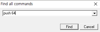디스어셈블리 창에서 우클릭 -> Search for -> All commands -> push 67 입력 -> find