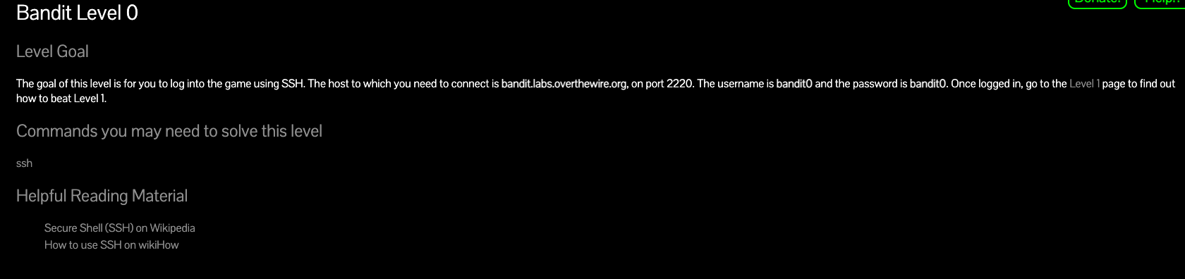 level0부터 쭉 있는데 level 0에서는 그저 ssh에 접속하라는 것과 유저 이름과 패스워드가 bandit0과 bandit0이라는 것만 알려주는데