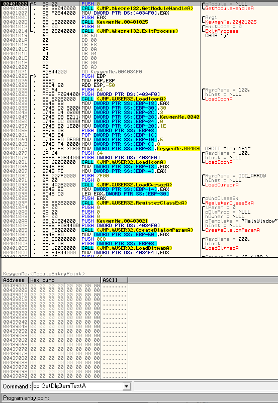 프로그램 내에서 어떠한 알고리즘을 이용해 시리얼 키를 생성할 것인데, 이 시리얼 키를 생성할 때 사용자가 입력한 값을 이용할 수도 있고 안 할 수도 있지만, 어쨌든 사용자가 입력한 값을 프로그램에서 읽어가게 되는데 이때 사용할만한 함수로는 GetDlgItemTextA()와 GetWindowTextA()이다.