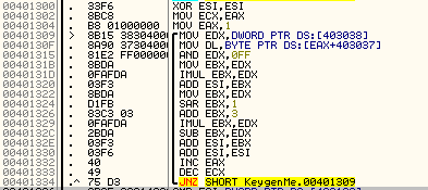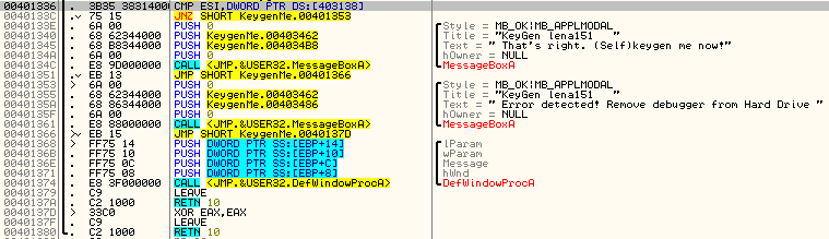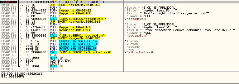 ESI의 값과 403138 주소에 있는 값과 같으면 That's right 메세지 창을 띄우는 부분으로 간다.