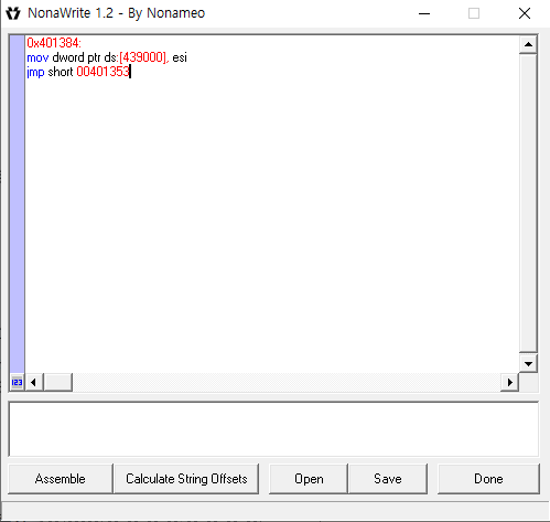 ollydbg에서 NonaWrite 플러그인을 이용해 위와 같이 작성한 후 Assemble을 누른다.