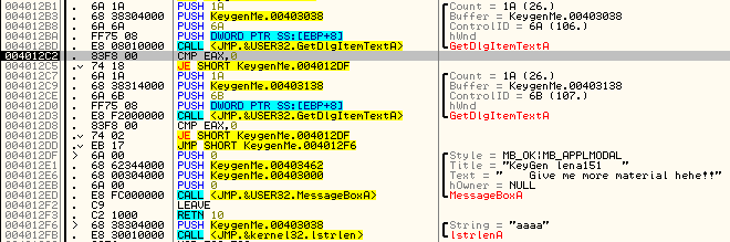 4012DF 주소에는 Give me more material hehe!! 메세지 창을 띄우는 부분으로 프로그램에 아무런 값도 입력하지 않고 Check 버튼을 눌렀을 때 실행되는 곳이다.