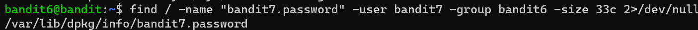 find / -name "bandit7.password" -user bandit7 -group bandit6 -size 33c 2>/dev/null