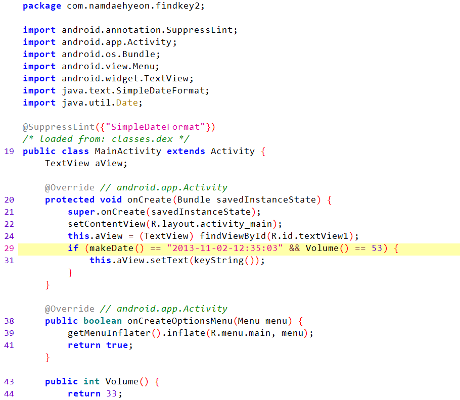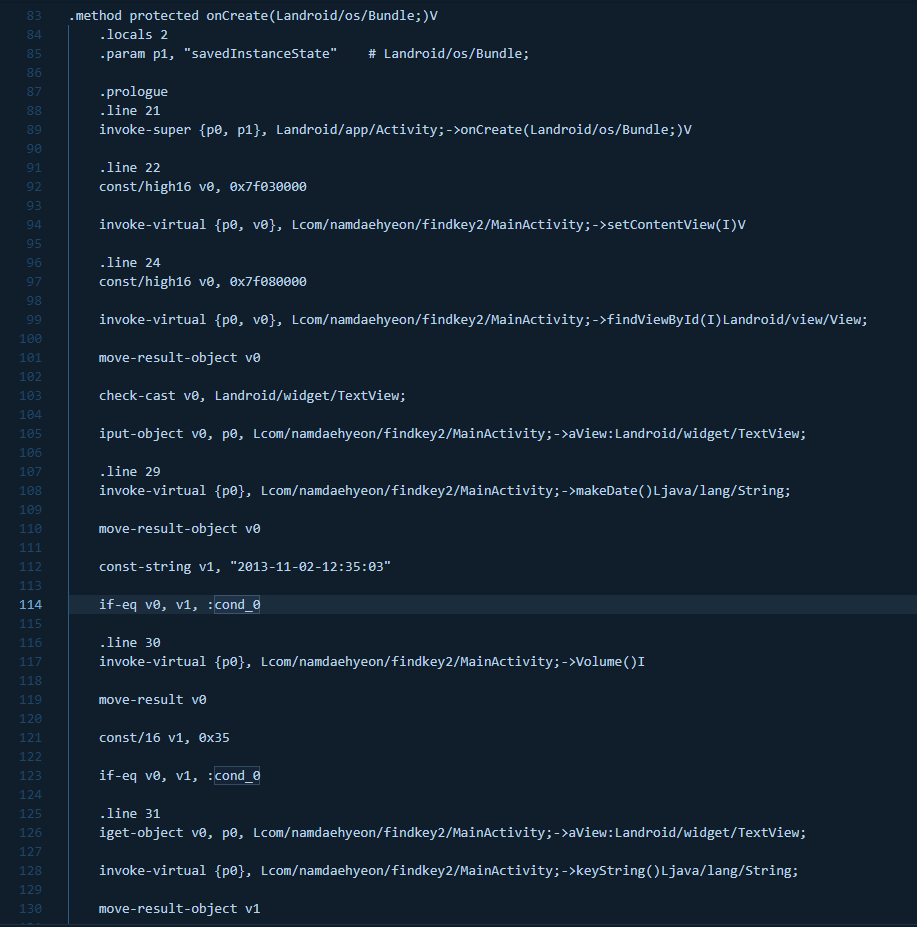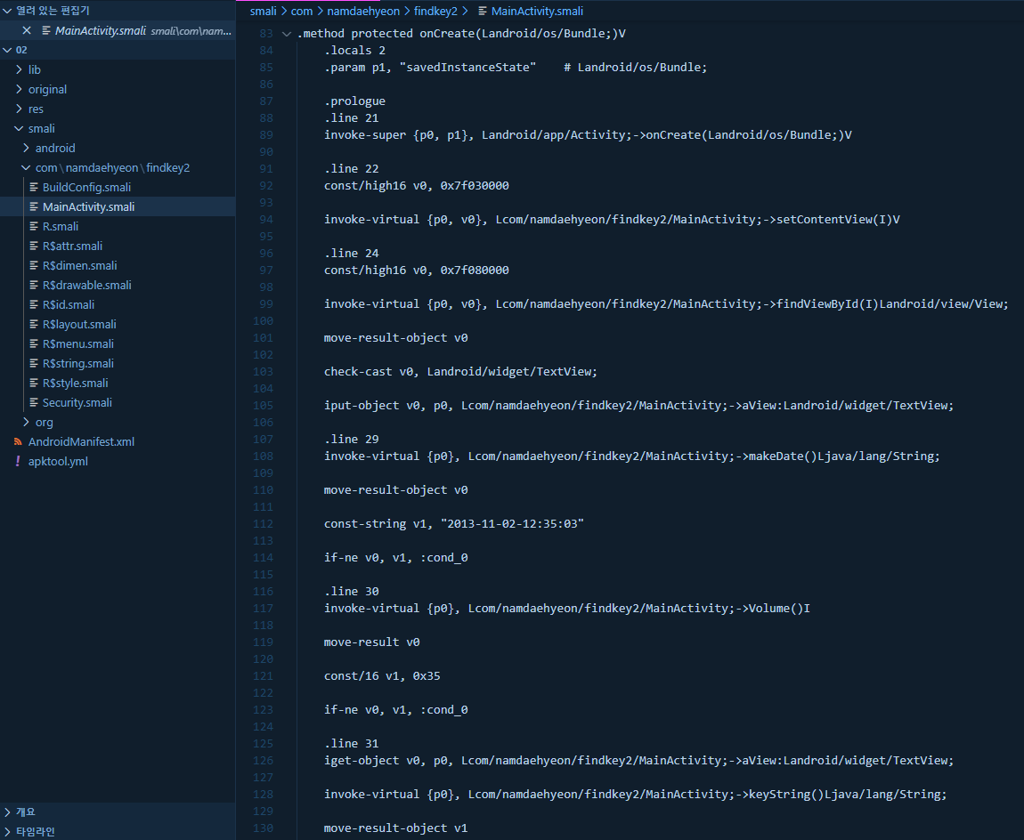 해당 02 폴더를 visual studio code로 열어 smali -> com\namdaehyeon\findkey2 -> MainActivity.smali 파일을 열면 위와 같이 나온다.