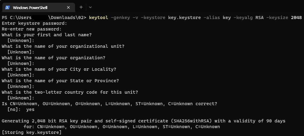 keytool -genkey -v -keystore key.keystore -alias key -keyalg RSA -keysize 2048