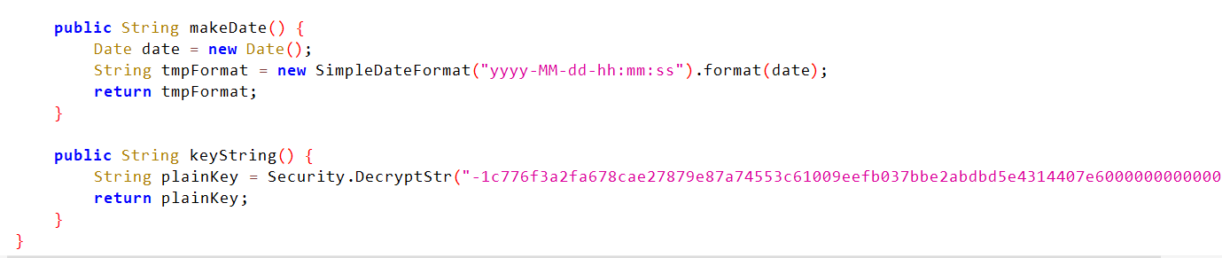 String plainKey = Security.DecryptStr("-1c776f3a2fa678cae27879e87a74553c61009eefb037bbe2abdbd5e4314407e60000000000000000");