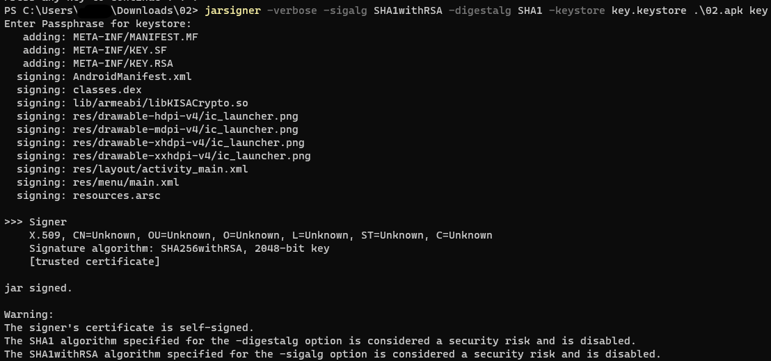 jarsigner -verbose -sigalg SHA1withRSA -digestalg SHA1 -keystore key.keystore .\02.apk key