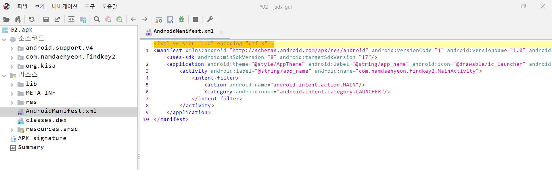 jadx-gui에서 02.apk 파일을 열어 리소스 -> AndroidManifest.xml 파일을 보면 위와 같이 나온다.