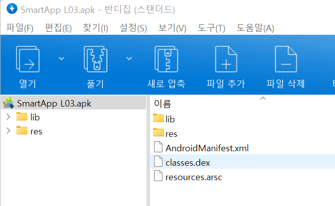 반디집으로 SmartApp L03.apk 파일을 열어보니 위와 같이 MobileApp Analysis L02에서처럼 서명 파일이 들어있는 META-INF 폴더가 없다.