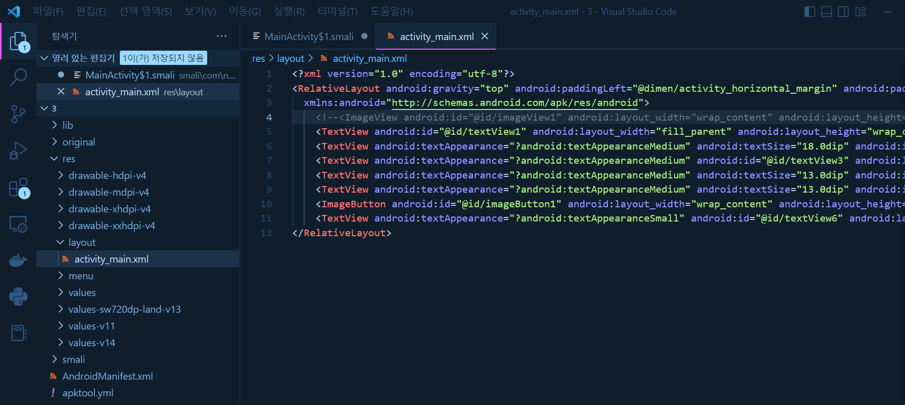 위와 같이 apktool로 디컴파일을 해준 뒤