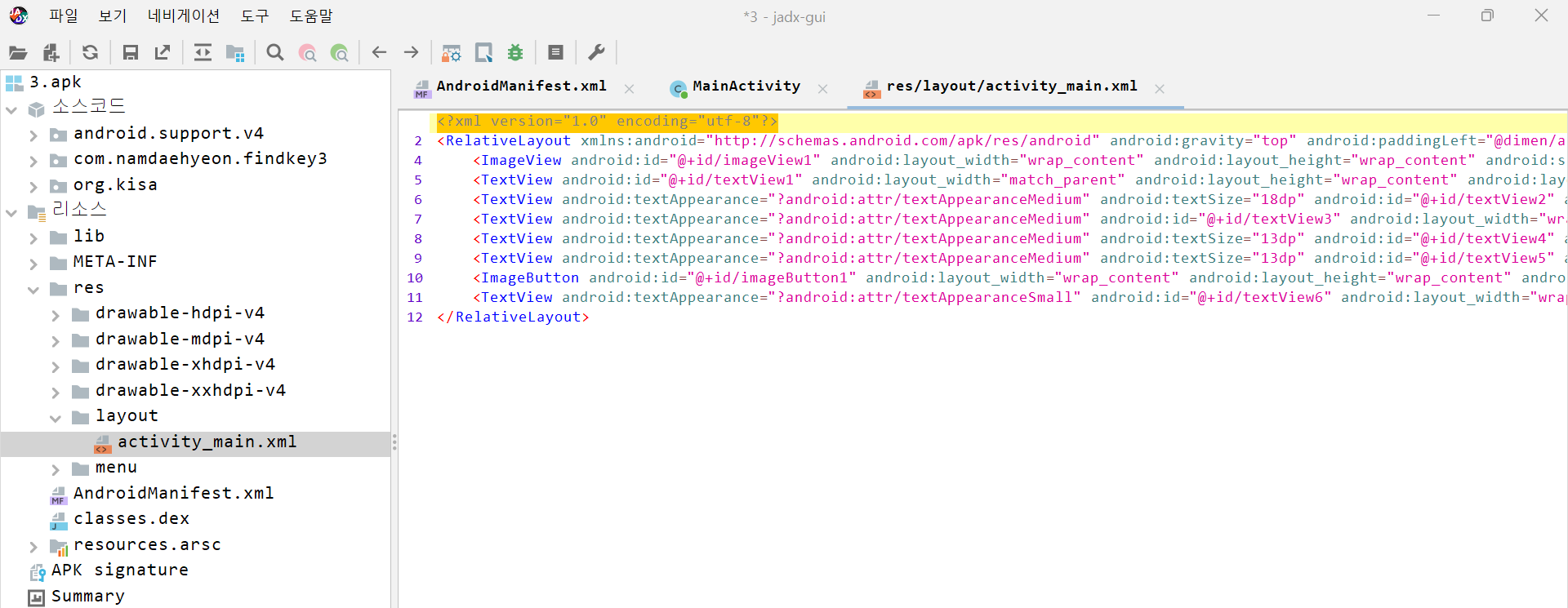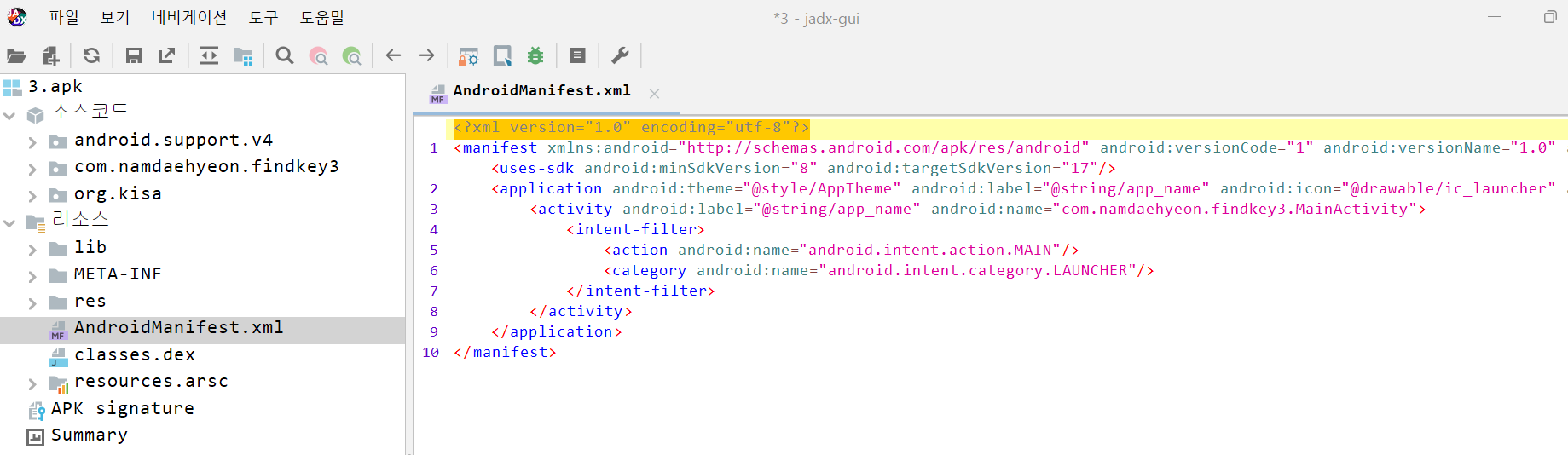 3.apk 파일을 jadx-gui에서 열고 AndroidManifest.xml 파일을 열면 위와 같이 나온다.