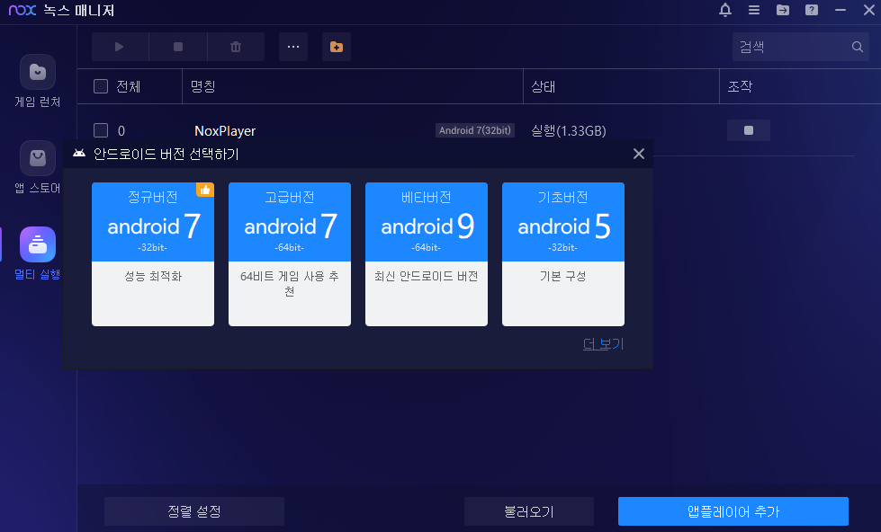 Nox 매니저 창에서 앱 플레이어 추가 버튼을 눌러 기초 버전인 Android 5 버전을 선택해 생성한다.