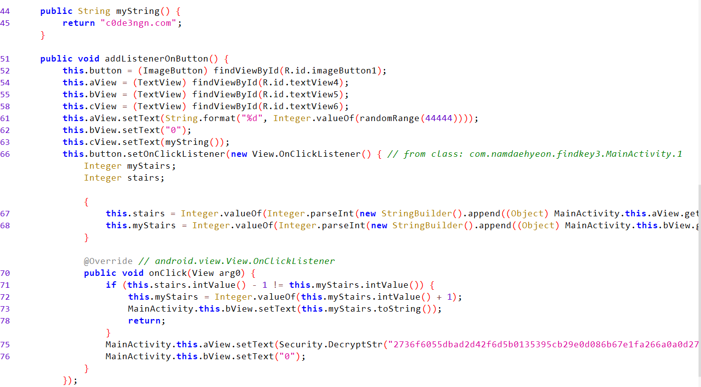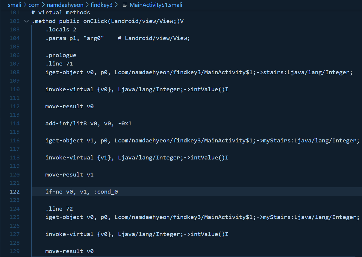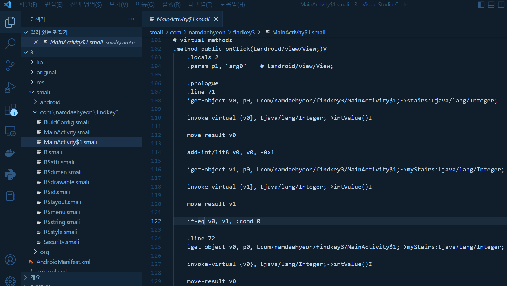 smali -> com -> namdaehyeon -> findkey3 -> MainActivity$1.smali 파일을 연다.