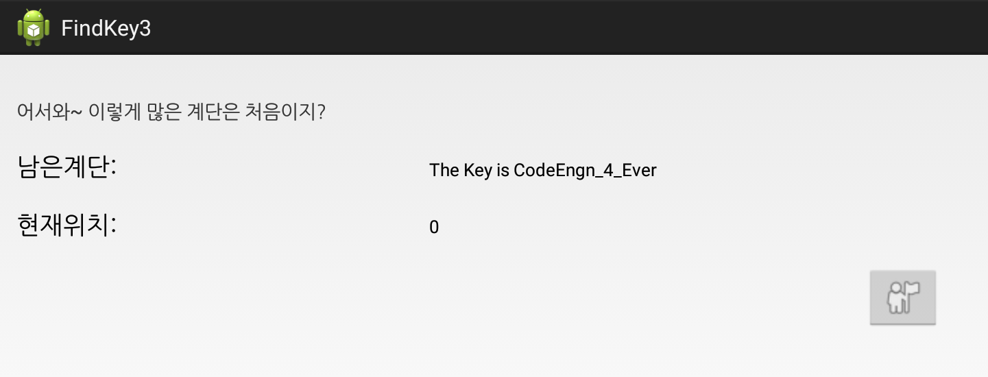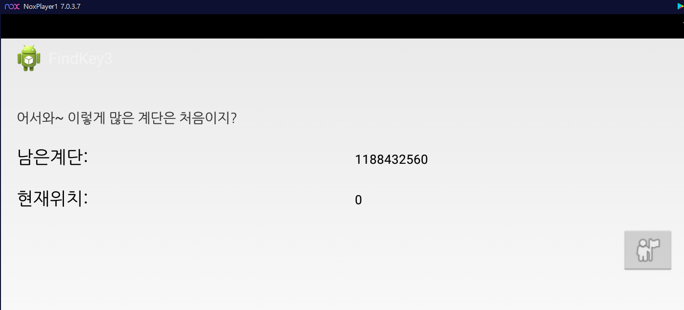 Nox Player에 수정된 내용이 적용된 3.apk 파일을 설치 후 실행했더니 위와 같이 Key 값은 나오지 않고, 남은 계단 수도 표시되지 않는다.