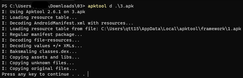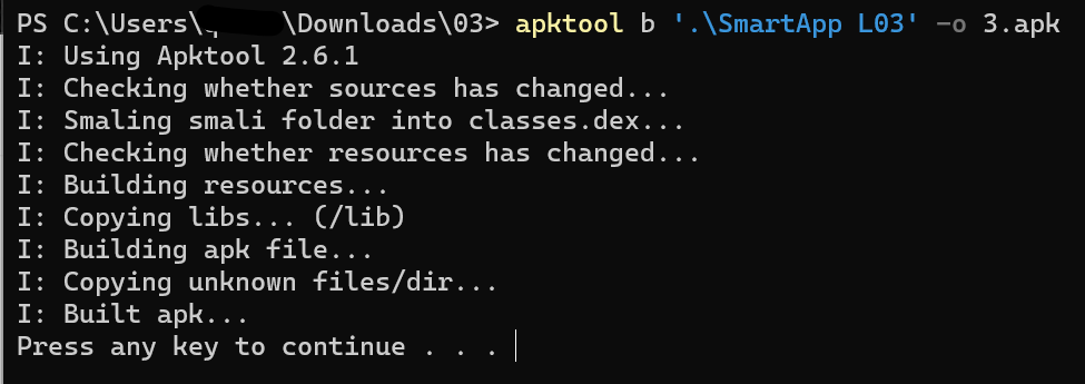 apktool b '.\SmartApp L03' -o 3.apk