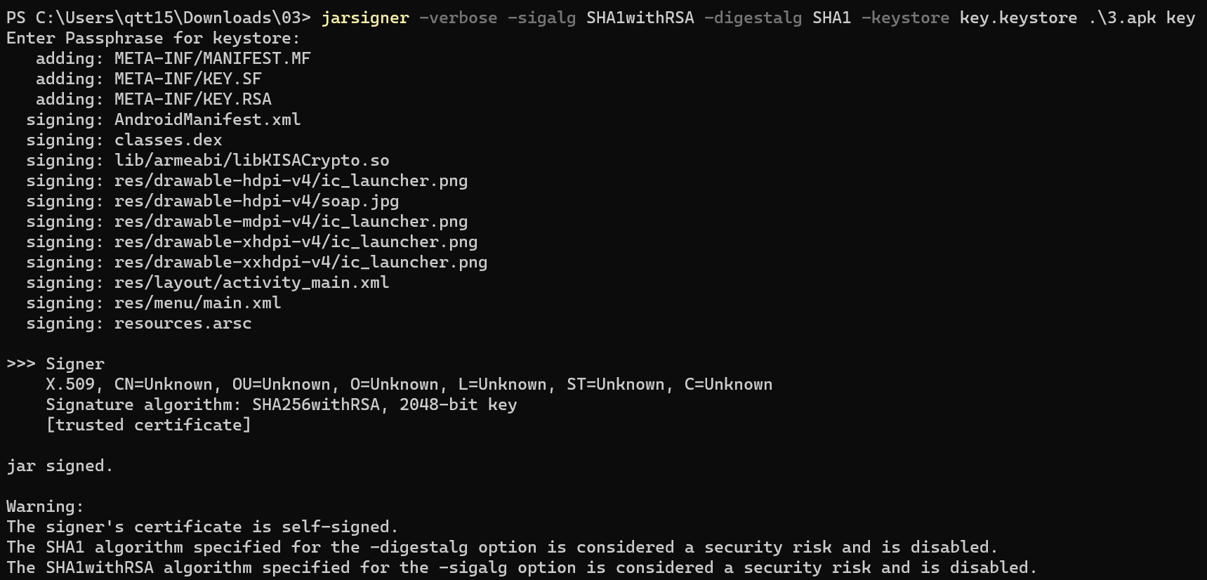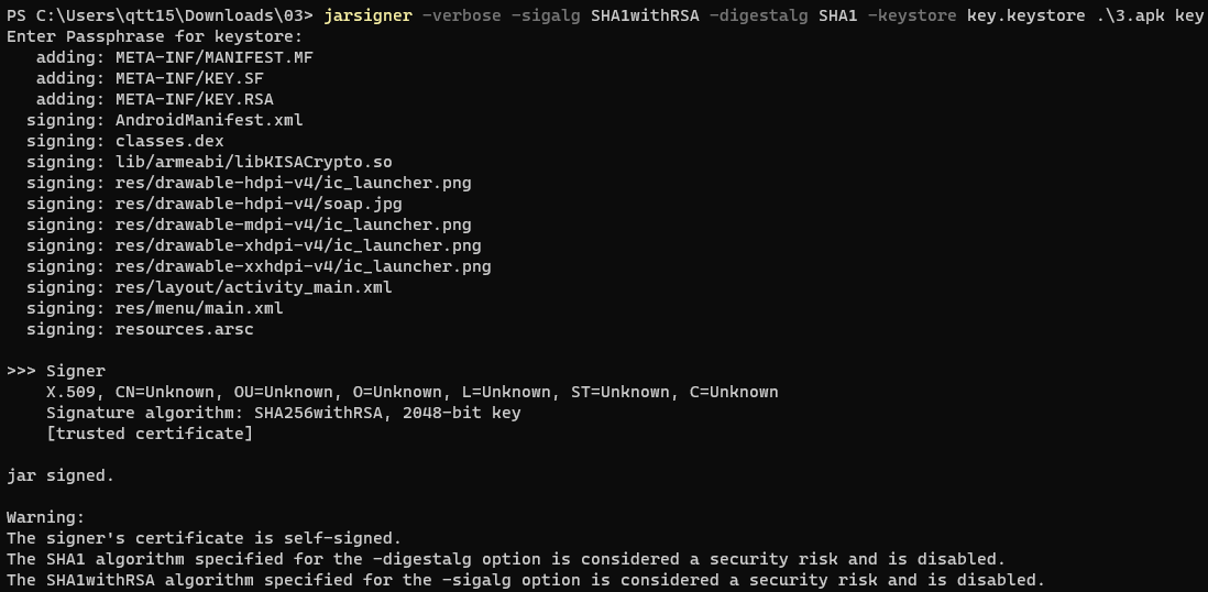 jarsigner -verbose -sigalg SHA1withRSA -digestalg SHA1 -keystore key.keystore .\3.apk key