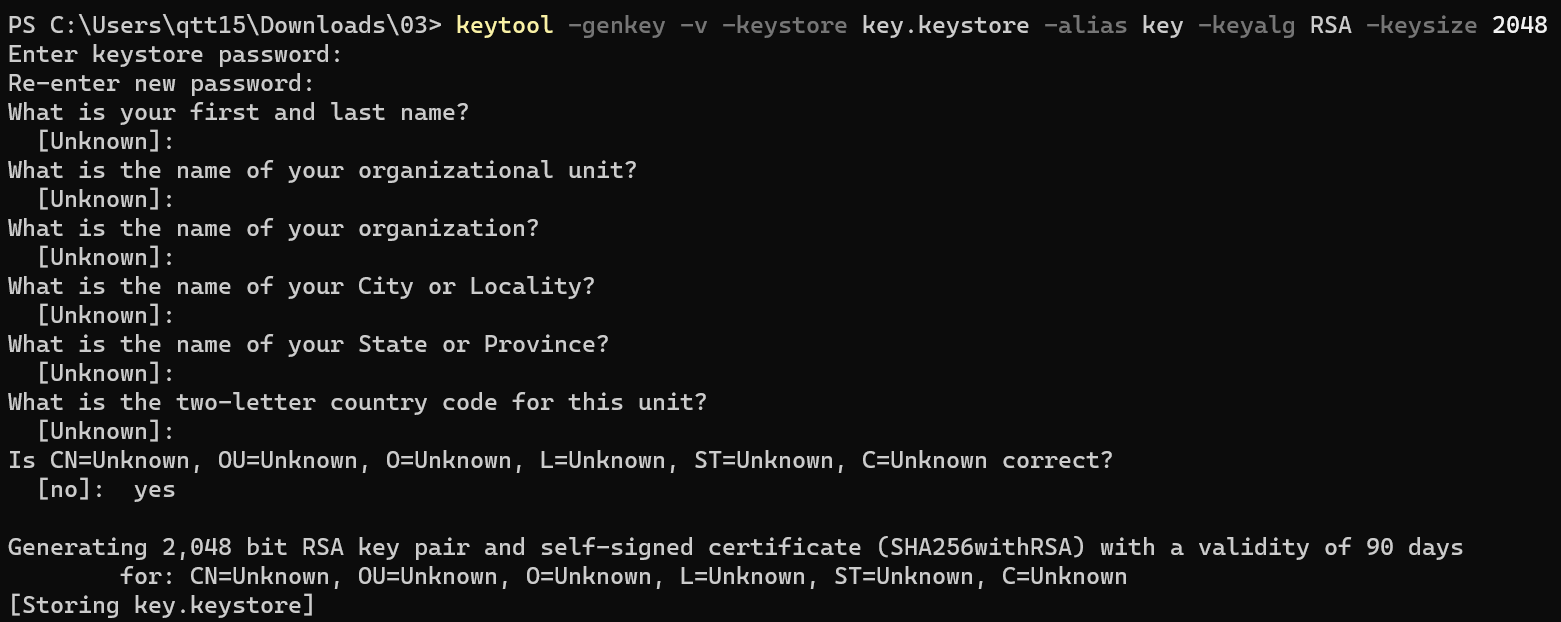 keytool -genkey -v -keystore key.keystore -alias key -keyalg RSA -keysize 2048