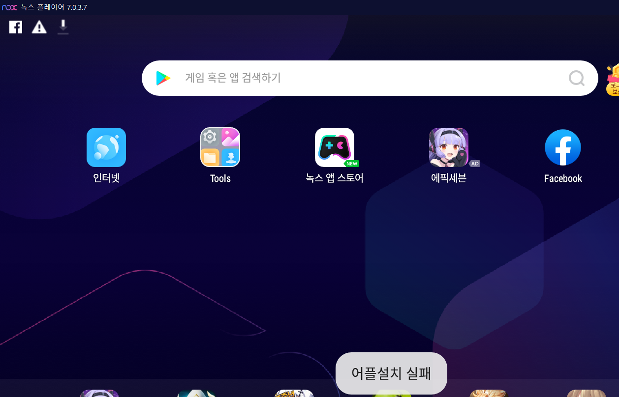 apk 파일을 nox player에 Drag & Drop 하니 위와 같이 어플 설치 실패라고 뜬다.