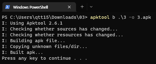 apktool b .\3 -o 3.apk