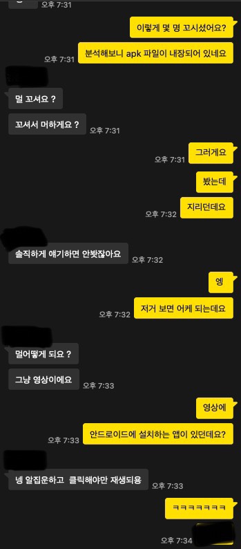 사진에는 없지만 상대방이 통화 하자느니 영통 걸겠다느니 이런 말들을 하다가 갑자기 진짜 보이스톡을 걸길래 안 받았다.