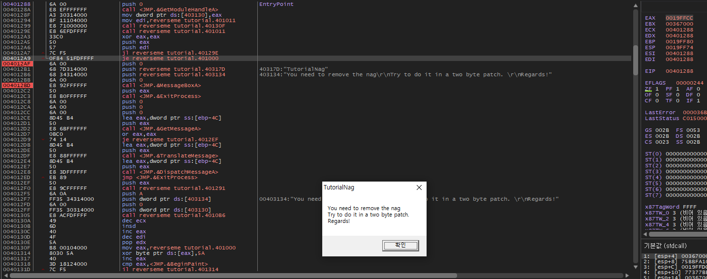 그리고 나서 F8 키를 눌러 40101F 주소에서 MessageBoxA() 함수를 호출하면 위와 같이 메세지 창이 뜬다.