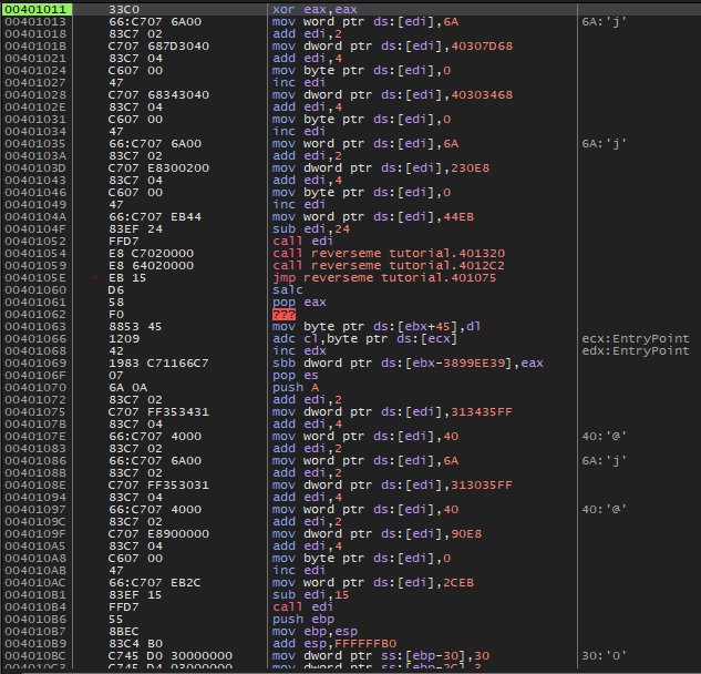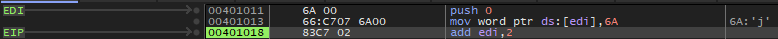 먼저, xor 연산으로 eax 레지스터의 값을 0으로 초기화하고, edi 레지스터에는 401011 주소가 담겨있는데 401011 주소에서 2byte 데이터에 6A를 저장한다.