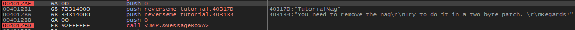 4012BD 주소에서 MessageBoxA 함수를 호출하는데 인자로 2byte를 패치해서 Nag를 없애라는 문자열이 있다.