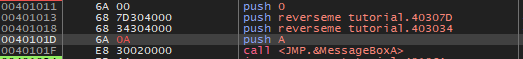 40101F 주소에서 messagebox() 함수를 호출하는데 인자값 부분의 값들이 어떤 문자열들인지 안 보이는 것으로 보아 아직 복호화가 덜 됐다는 걸 알 수 있다.