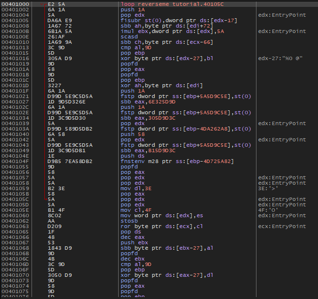 401314 주소부터 40131D 주소까지가 401000 주소 ~ 401218 주소에 있는 암호화 된 바이트 코드를 대상으로 xor 연산으로 복호화 하는 루프이고, 이 루프를 Decrypting 루프라고 한다.