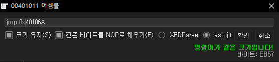MessageBoxA() 함수에 첫 번째로 들어가고 있는 401011 주소의 push 0 명령어를 위와 같이 jmp 0x40106A로 바꿔줌으로써 40101F 주소에서 Nag 창을 띄우는 MessageBoxA() 함수를 호출하는 명령어를 건너뛰고 바로 40106A 주소로 점프하도록 한다.