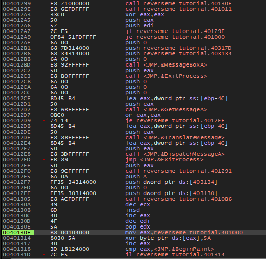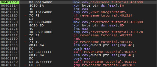 401000 주소에 있는 1byte 데이터를 5A와 xor 연산하고, eax의 값을 1 증가한 뒤 BeginPaint() 함수로 점프하는 명령어가 있는 주소와 비교한다.