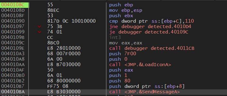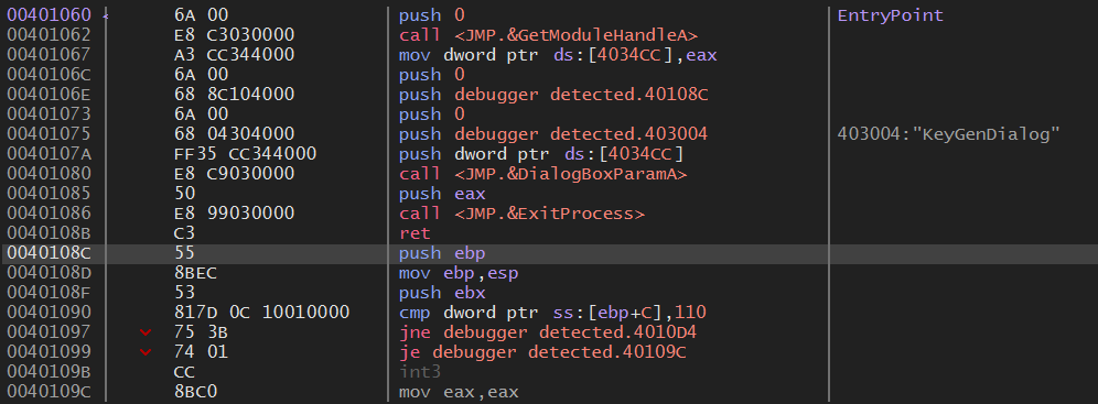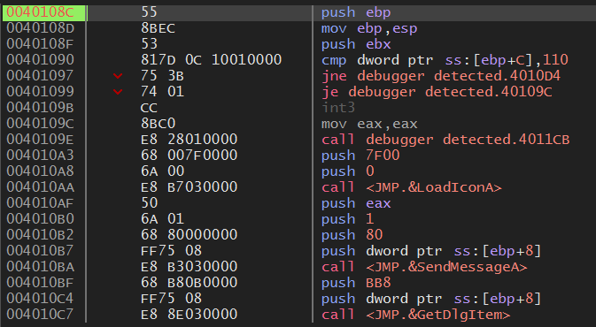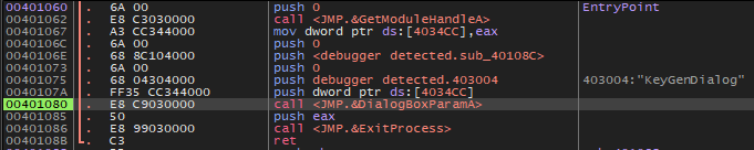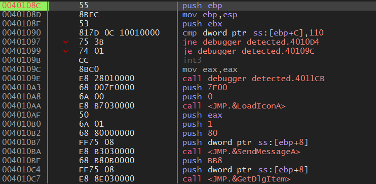 즉, 함수 내에서 디버거 탐지를 하고 탐지가 되면 lpDialogFunc 인자에 에러 대화 상자 주소를 push 하는 것이다.