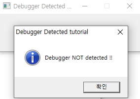 디버거에 올린 후 F9 키를 눌러 실행해봤는데 위와 같이 디버거가 탐지되지 않았다고 뜬다?