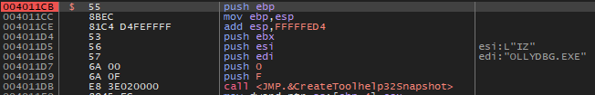 즉, 위의 루프에서는 스냅샷 된 프로세스 목록에서 OLLYDBG.EXE 문자열과 일치한 프로세스가 나올 때까지 프로세스 정보를 가져와 비교한다.