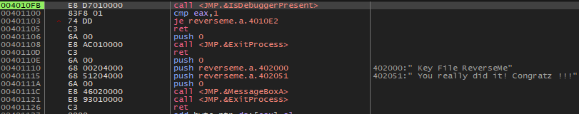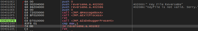 그렇다면 4010FB 주소의 함수 내에서 IsDebuggerPresent 함수의 결과가 1이면, 즉 디버깅 중이면 401103 주소에서 4010E2 주소로 점프하고, keyfile is not valid. Sorry 문자열을 띄우는데
