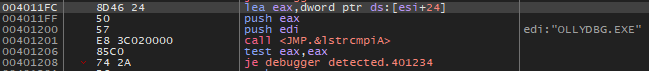 이 함수의 결과로 성공적으로 프로세스를 가져왔다면 lstrcmpiA 함수로 비교한 뒤 같으면 401234 주소로 점프하여 디버거가 탐지되었다는 메세지 창을 띄우고, 같지 않으면 40120A 주소로 점프하여 Process32Next 함수를 다시 호출한다.