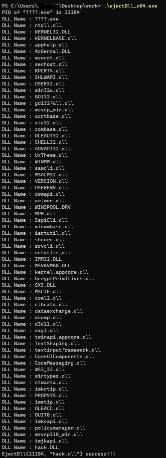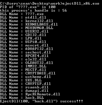 BOOL EjectDll(DWORD dwPID, LPCTSTR szDllName)