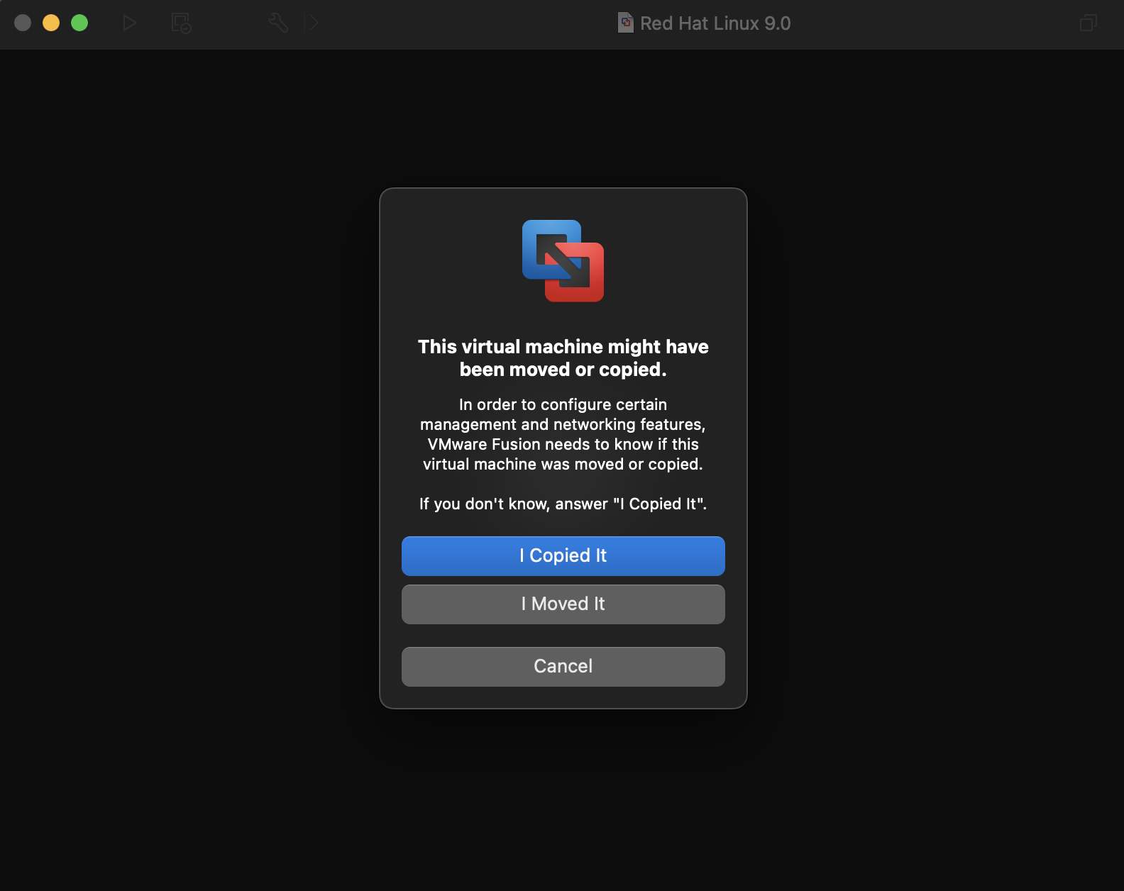 이 중 Red Hat Linux.vmx를 더블 클릭하면, VMware Fusion이 실행된다.