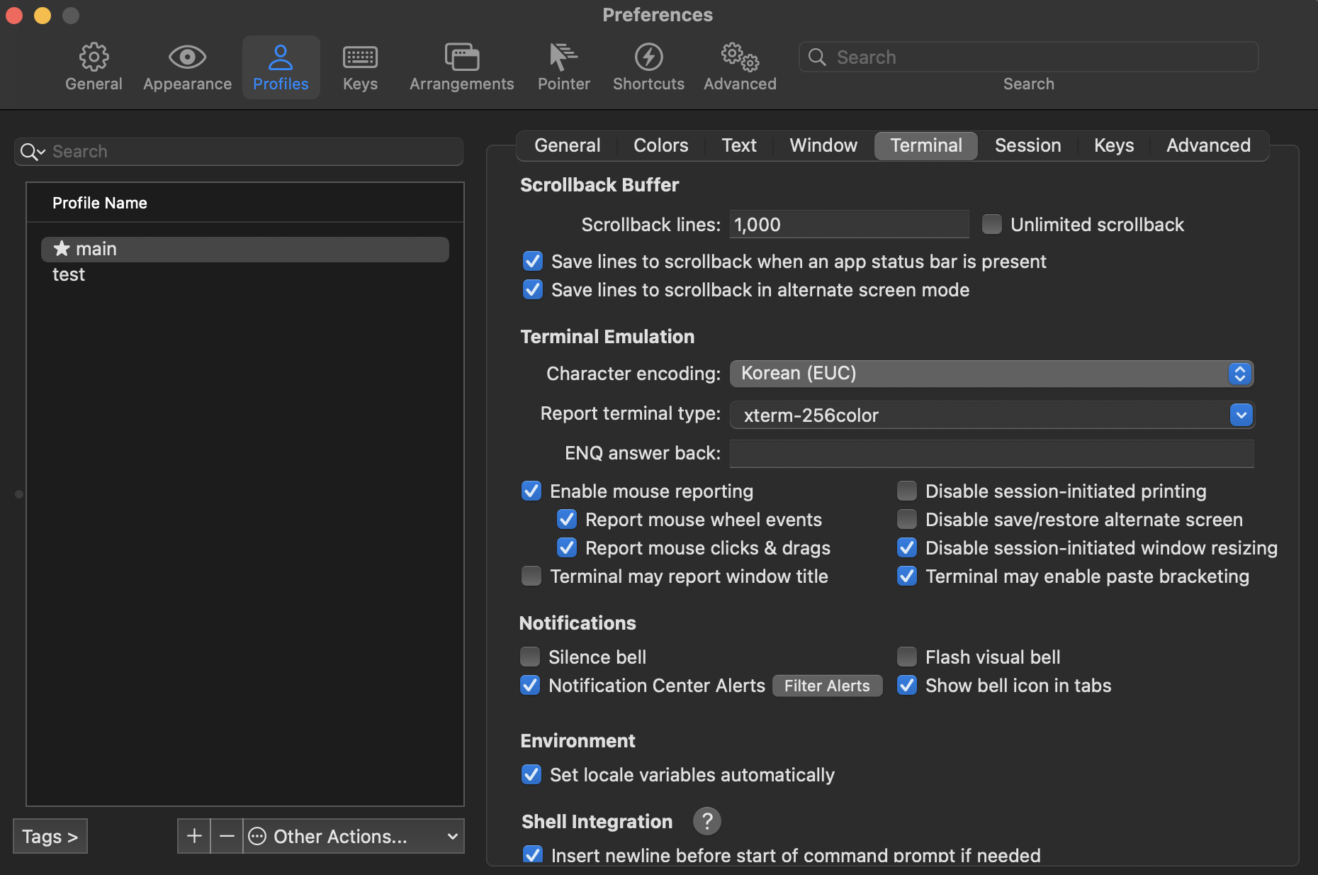 터미널 설정 -> Profiles(프로파일) -> Terminal -> Character encoding의 값을 원하는 언어의 EUC 인코딩으로 설정